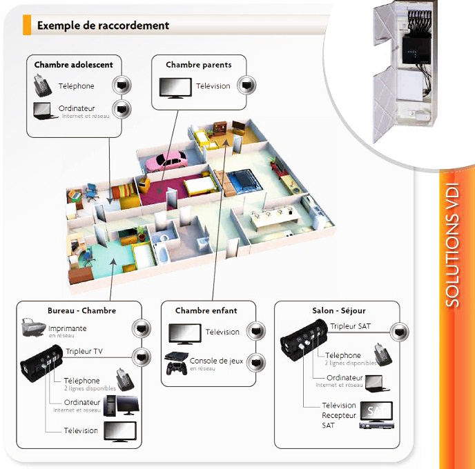 Le principe : chaque prise RJ45 est câblée individuellement jusqu'a un "cœur" appelé «le coffret VDI», situé à côté du tableau électrique. Ce coffret est capable de traiter 3 grands types de signaux : Téléphone, Informatique, Télévision. Ainsi, vos appareils peuvent être branchés sur n'importe quelle prise de votre maison